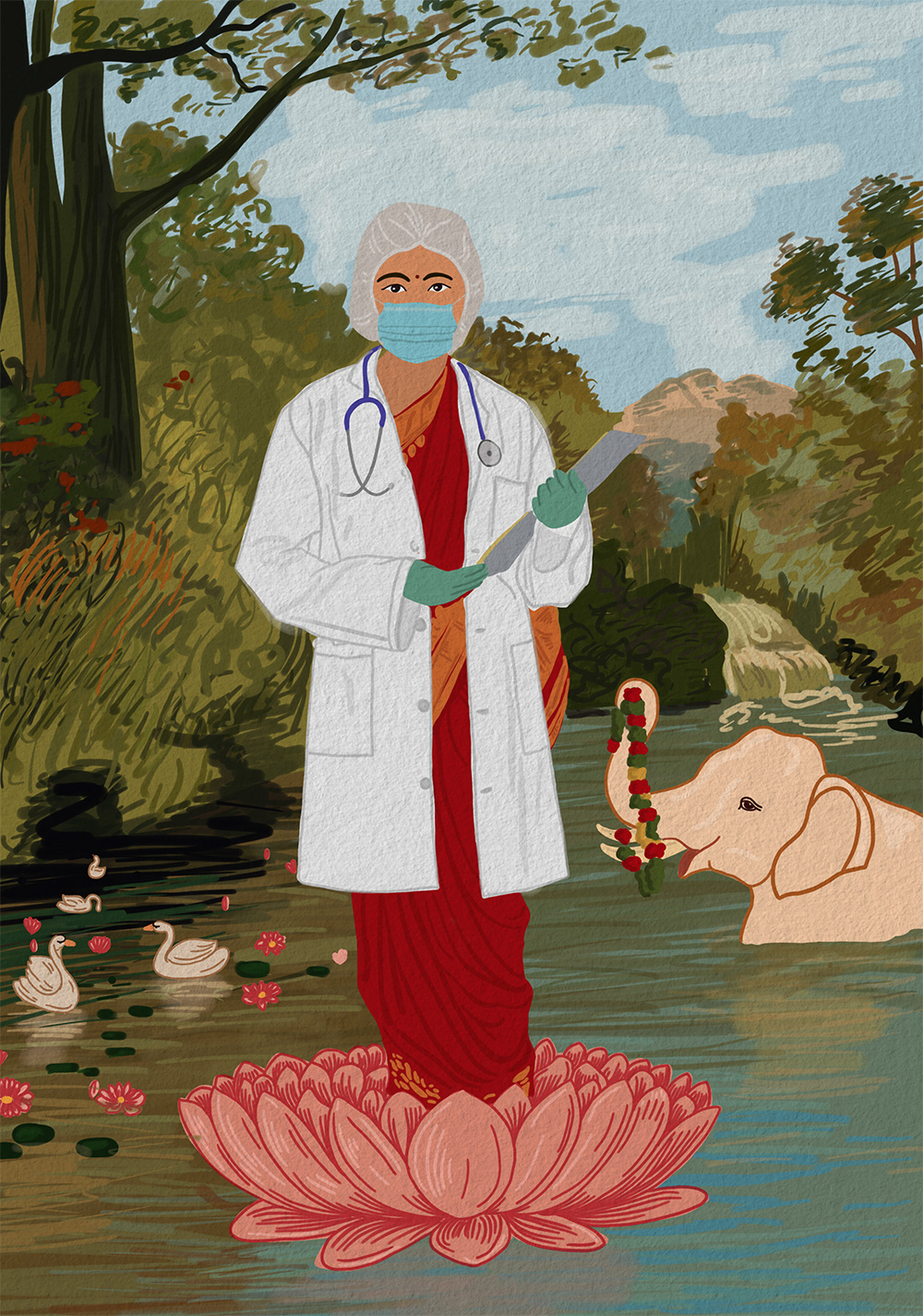 During the unfortunate pandemic, the role of doctors and nurses becomes incredibly valuable and significant. This piece is a reimagining of Raja Ravi Verma's artwork, in which a doctor takes the form of a Goddess. People prayed and thanked the doctors for being the public's last hope. They are deserving of a tribute, and this artwork is one way to do so. My piece also takes into account the growing role of women in our society.